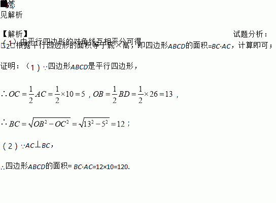 如图:平行四边形ABCD的对角线AC、BD交于点O,AC⊥BC,AC=10,BD=26.(1)求BC的长,(2)求平行四边形ABCD的面积.