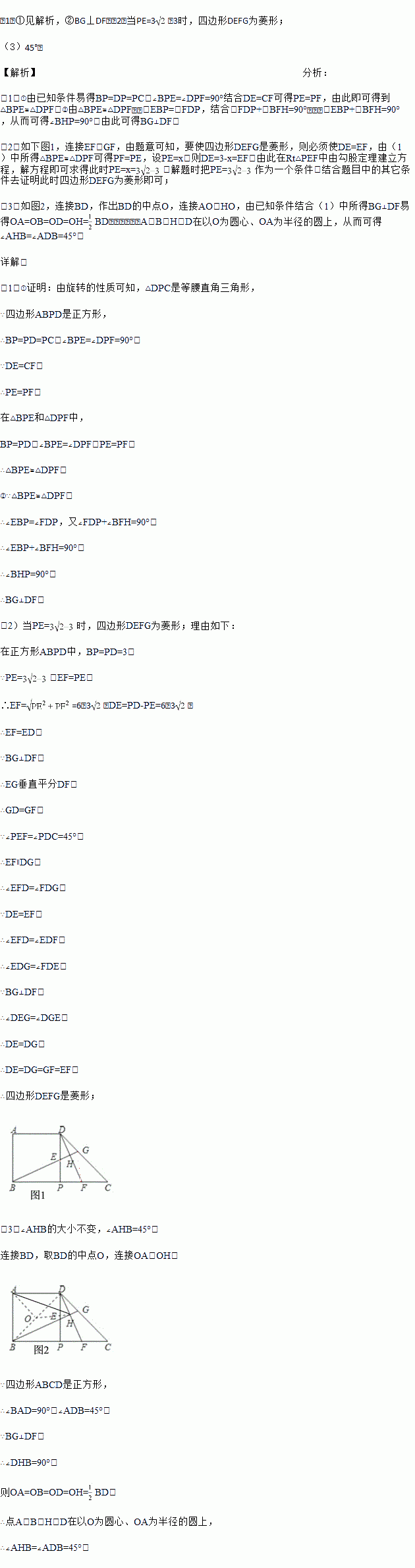 (1)①求证:△BPE≌△DPF,②判断BG与DF位置关系并说明理由;