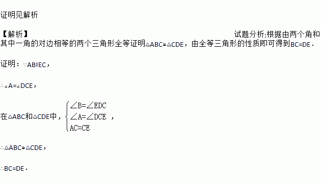 已知:如图,点A,D,C在同一直线上,AB∥EC,AC=CE,∠B=∠EDC,求证:BC=DE