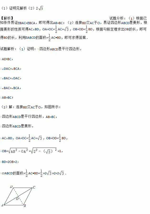 (2)若AB=2,AC=2,求?ABCD的面积.