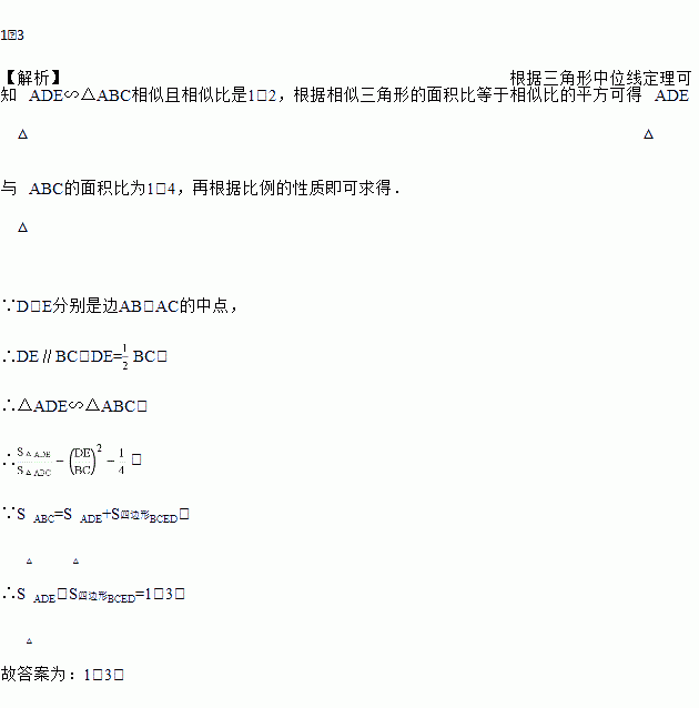 如图,在△ABC中,D,E分别是边AB,AC的中点,则△ADE与四边形BCED的面积比S△ADE:S四边形BCED=_____.