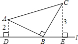 如图,直线l过等腰直角三角形ABC顶点B,A、C两点到直线l的距离分别是2和3,则AB的长是