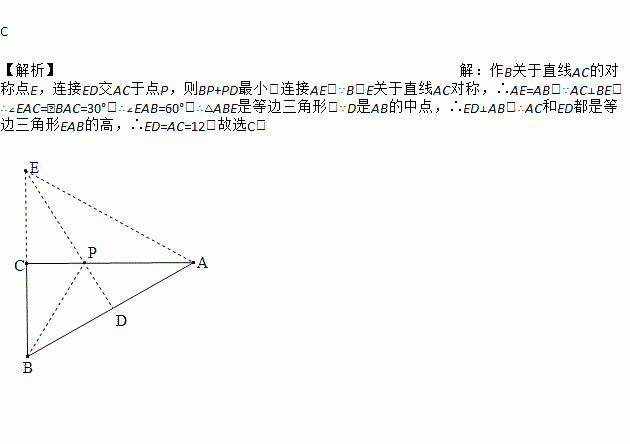 如图,在△ABC中,∠C=90°,∠A=30°,AC=12,点D为AB的中点,点P为AC上一动点,则PB+PD的最小值为( )