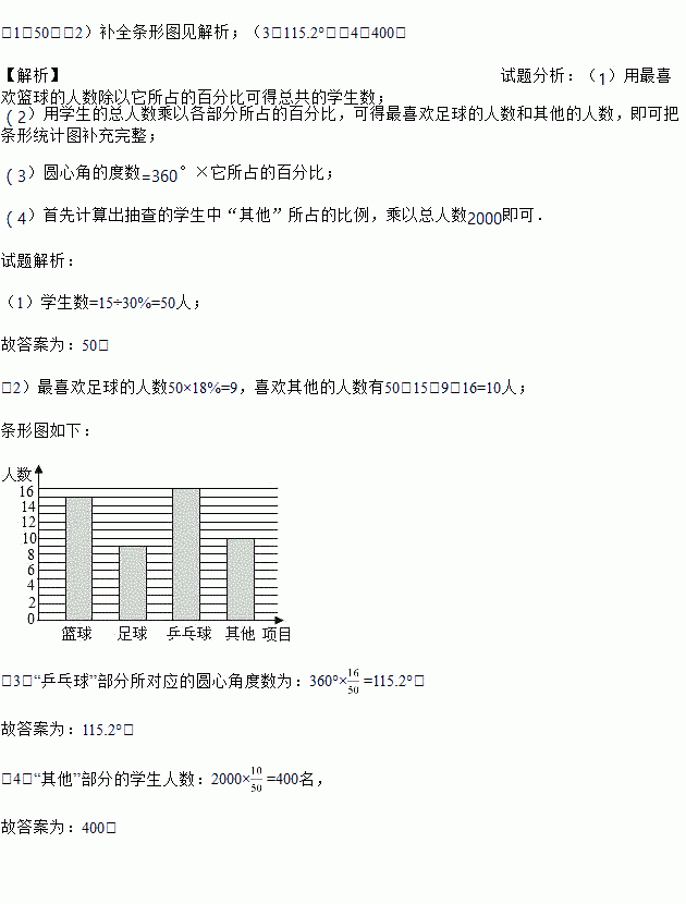 (3)在扇形统计图中,“乒乓球”部分所对应的圆心角度数为 ;