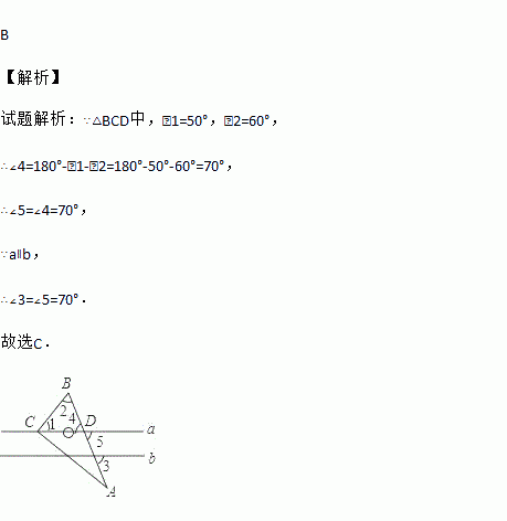 如图,将三角尺的直角顶点放在直线a上,a∥b,∠1=50°,∠2=70°,则∠3=( )