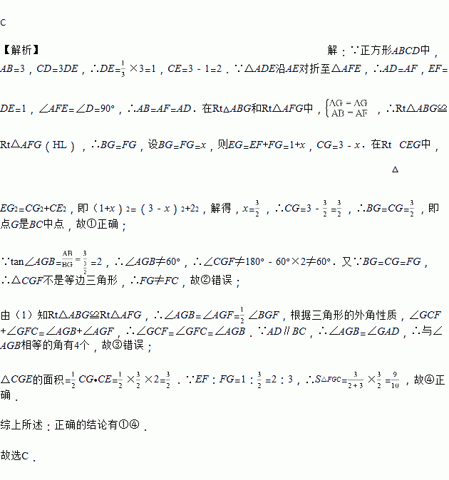 如图,正方形ABCD中,AB=3,点E在边CD上,且CD=3DE,将△ADE沿AE对折至△AFE,延长EF交边BC于点G,连接AG、CF.下列结论:①点G是BC中点;②FG=FC;③与∠AGB相等的角有5个;④S△FGC=