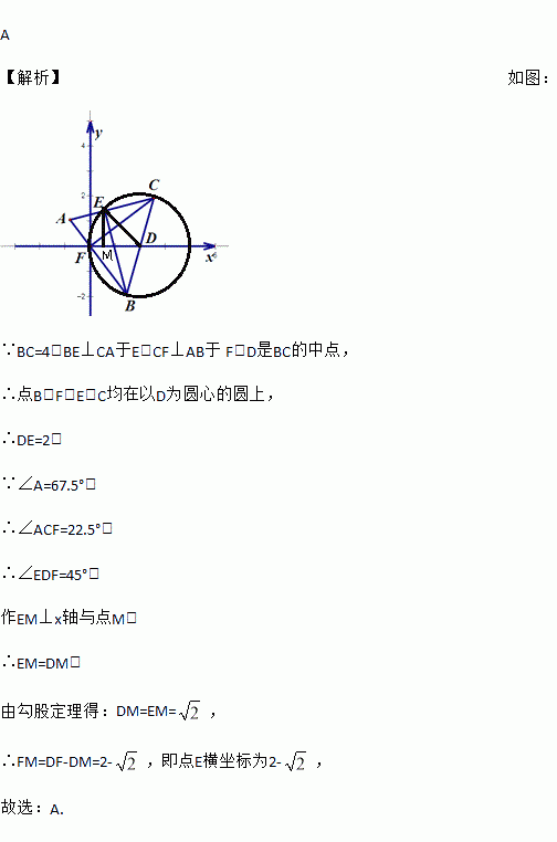 如图,△ABC中,∠A=67.5°,BC=4,BE⊥CA于E,CF⊥AB于 F,D是BC的中点.以F为原点,FD所在直线为x轴构造平面直角坐标系,则点E的横坐标是( )