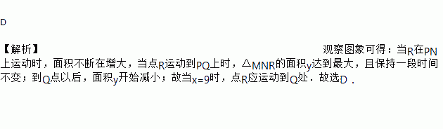 如图①,在长方形MNPQ中,动点R从点N出发,沿N→P→Q→M方向运动至点M处停止.设点R运动的路程为x,△MNR的面积为y,如果y关于x的函数图像如图②所示,则当x=9时,点R应运动到( )