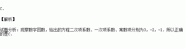 一元二次方程3x2-2x-1=0的二次项系数、一次项系数、常数项分别为( ).