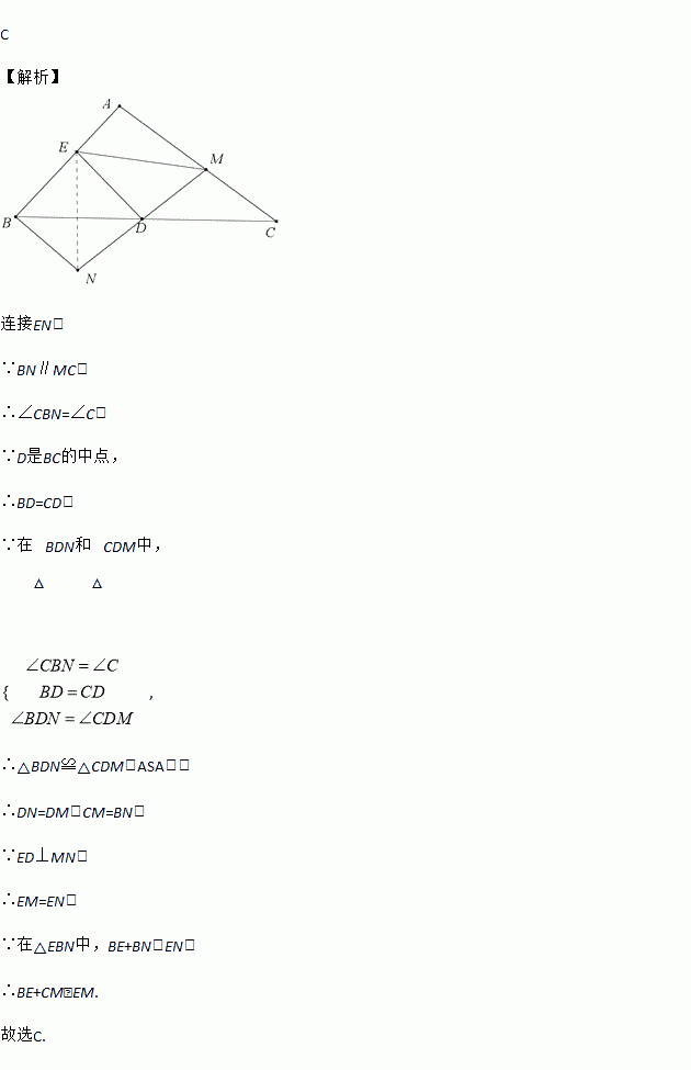 Èçͼ£¬¡÷ABCÖУ¬DÊÇBCµÄÖе㣬¹ýµãDµÄÖ±ÏßMN½»±ßACÓÚµãM£¬½»ACµÄƽÐÐÏßBNÓÚµãN£¬DE¡ÍMN£¬½»±ßABÓÚµãE£¬Á¬½áEM£¬ÏÂÃæÓйØÏß¶ÎBE£¬CM£¬EMµÄ¹ØÏµÊ½ÕýÈ·µÄÊÇ£¨¡¡¡¡£©