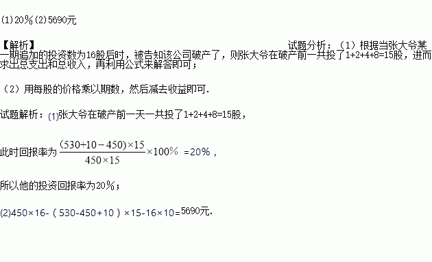 (1)假设张大爷在该公司破产的前一期停止投资,他的投资回报率是多少?