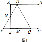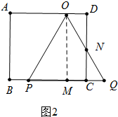 6.矩形ABCD中,AB=2$\sqrt{3}$,AD=4,如图,有一个边长为4的等边三角形OPQ,O点与A点重合,PQ在直线BC上,△OPQ沿着BC方向以每秒1个单位长度的速度平移,当O点平移到D点时运动停止,设平移时间为t秒,求两个图形重合部分的面积S关于t的函数关系式,并注明t的取值范围.分析 当0≤t≤2时,如图1中作OM⊥BC于M,根据S=S△OPQ-S△PBN即可计算,当2<t≤4时,如图2中,根据S=S△POQ-S△CNQ即可计算.