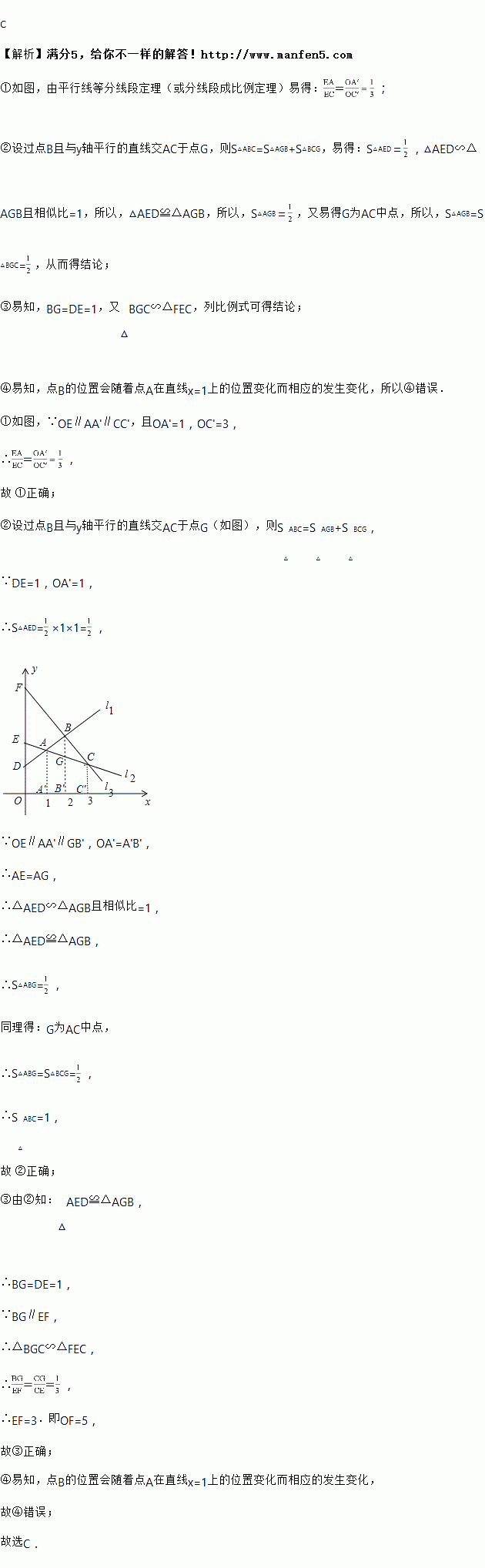 如图,l1、l2、l3两两相交于A、B、C三点,它们与y轴正半轴分别交于点D、E、F,若A、B、C三点的横坐标分别为1、2、3,且OD=DE=1,则下列结论正确的个数是( )