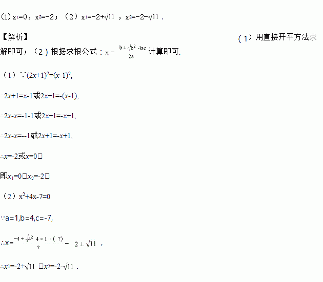 解方程:(1)(2x+1)2=(x-1)2;(2)x2+4x-7=0