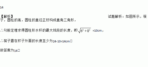 如图,将一根长24厘米的筷子,置于底面直径为6厘 米,高为8厘米的圆柱形水杯中,则筷子露在杯子外面的长度至少为_______厘米.