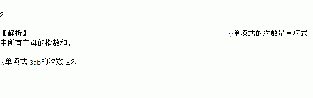 2 【解析】∵单项式的次数是单项式中所有字母的指数和, ∴单项式-3ab的次数是2.