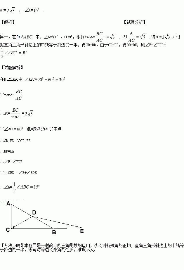 如图,已知△ABC中,∠C=90°,∠A=60°,BC=6,点D是斜边AB的中点,点E在CB的延长线上,且CD = BE.求AC的长和∠E的度数