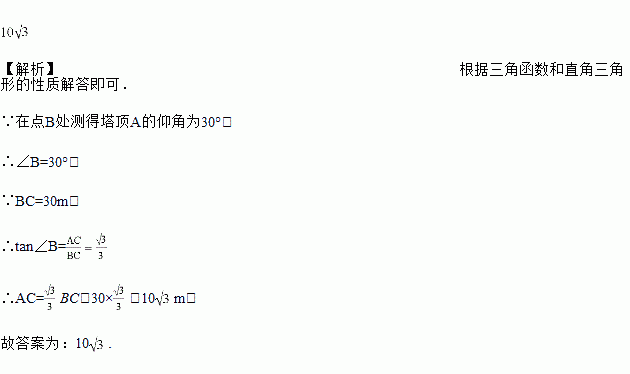 如图,在点B处测得塔顶A的仰角为30°,点B到塔底C的水平距离BC是30m,那么塔AC的高度为__m(结果保留根号).