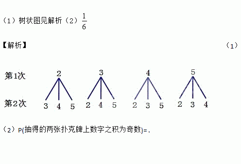 (1)树状图见解析(2) 【解析】(1) (2)P(抽得的两张扑克牌上数字之积为奇数)= .