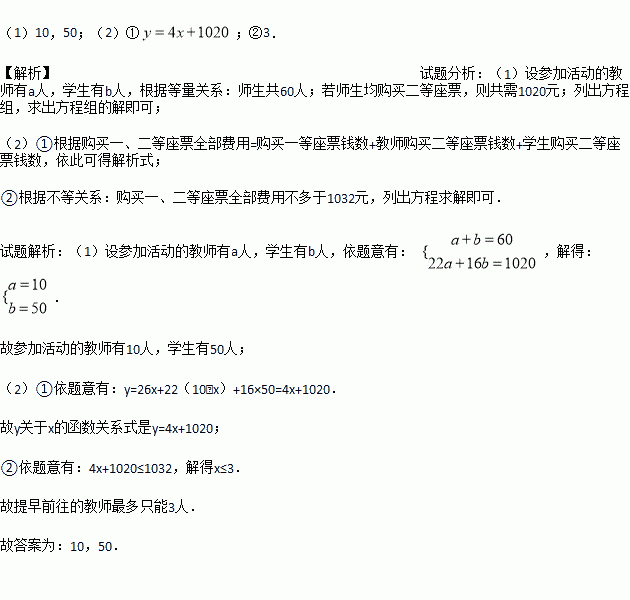②若购买一、二等座票全部费用不多于1032元,则提早前往的教师最多只能多少人?