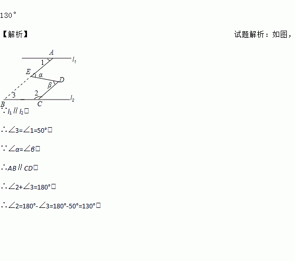 如图,直线l1∥l2,∠α=∠β,∠1=50°,则∠2=______