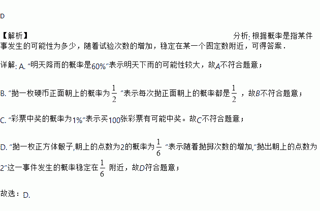 A. “明天降雨的概率是60%”表示明天有60%的时间都在降雨