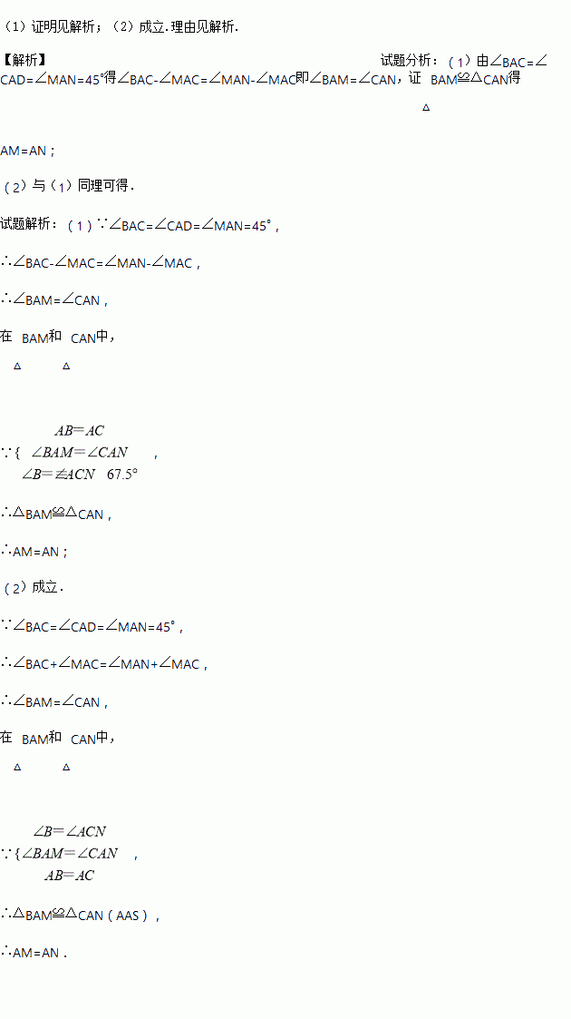 (1)当三角板旋转到如图1的位置时,三角板的两边与等腰三角形的两底边分别相交于M、N两点,求证:AM=AN;