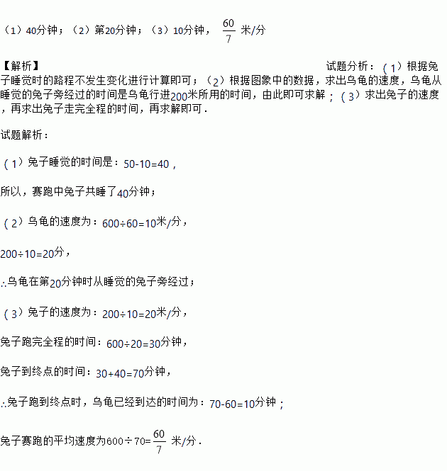 有一天,龟、兔进行了600米赛跑,如图表示龟兔赛跑的路程s(米)与时间t(分钟)的关系(兔子睡觉前后速度保持不变),根据图象回答以下问题:
