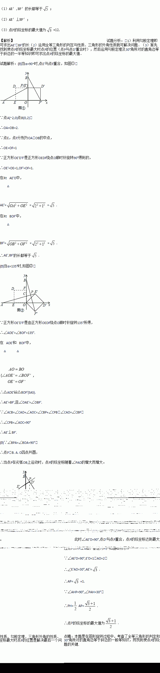在平面直角坐标系中,O为原点,点A(﹣2,0),点B(0,2),点E,点F分别为OA,OB的中点.若正方形OEDF绕点O顺时针旋转,得正方形OE′D′F′,记旋转角为α.