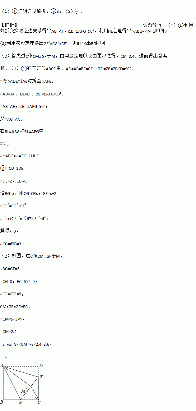 如图,正方形ABCD中,CD=6,点E在边CD上,且CD=3DE.将△ADE沿AE对折至△AFE,延长EF交边BC于点G,连结AG、CF.