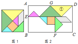 如图2,小靓用七巧板拼成一幅装饰图,放入长方形ABCD内,装饰图中的三角形顶点E,F分别在边AB,BC上,三角形①的边GD在边AD上,则的值是_____.