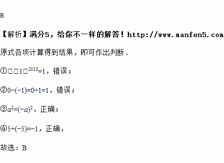 丁丁做了以下四道计算题:①(﹣1)2018=2018;②0﹣(﹣1)=﹣1;③a2=(﹣a)2,④5÷(﹣5)=﹣1,请您帮他检查一下,他一共做对了( )