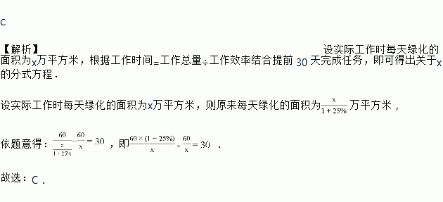 “绿水青山就是金山银山”.某工程队承接了60万平方米的荒山绿化任务,为了迎接雨季的到来,实际工作时每天的工作效率比原计划提高了25%,结果提前30天完成了这一任务.设实际工作时每天绿化的面积为x万平方米,则下面所列方程中正确的是( )