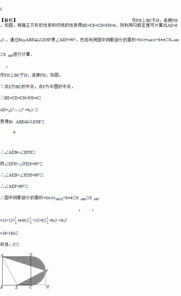 如图,在正方形ABCD中,AB=12,点E为BC的中点,以CD为直径作半圆CFD,点F为半圆的中点,连接AF,EF,图中阴影部分的面积是( )