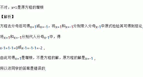 某同学解分式方程=0,得出原方程的解为x=1或x=—1。你认为他的解答对吗?请你作出判断,并说明理由______________________________。