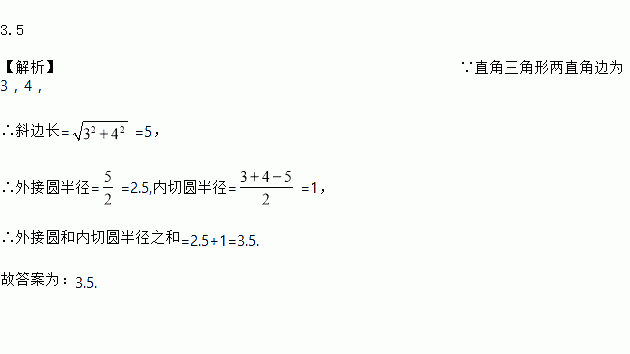 3.5 【解析】∵直角三角形两直角边为3,4, ∴斜边长==5, ∴外接圆半径==2.5,内切圆半径==1, ∴外接圆和内切圆半径之和=2.5+1=3.5. 故答案为:3.5.