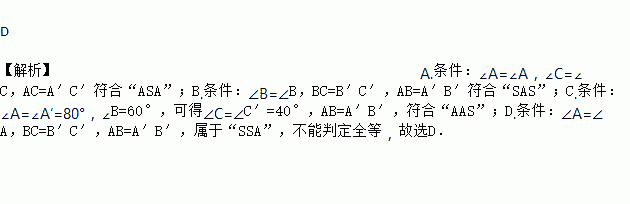 C. ∠A=∠A′=80°,∠B=60°,∠C′=40°,AB=A′B′