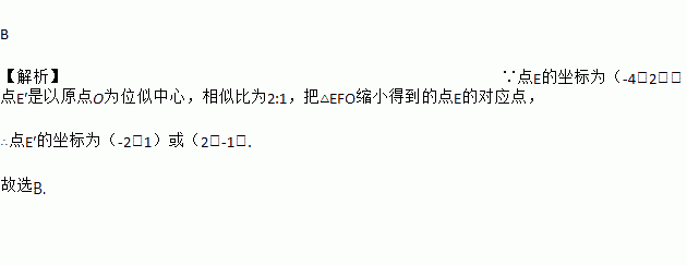 B 【解析】∵点E的坐标为(-4,2),点E′是以原点O为位似中心,相似比为2:1,把△EFO缩小得到的点E的对应点, ∴点E′的坐标为(-2,1)或(2,-1). 故选B.