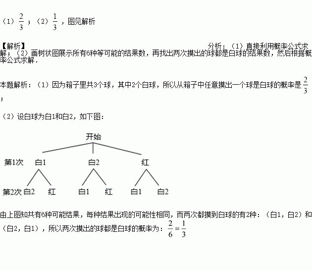 (2)从箱子中任意摸出一个球,不将它放回箱子,搅匀后再摸出一个球,求两次摸出的球都是白球的概率,并画出树状图或列出表格。