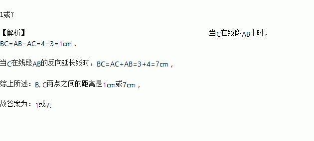 已知点A、B、C在同一直线上,AB=4cm,AC=3cm,则B、C两点之间的距离是_______cm。