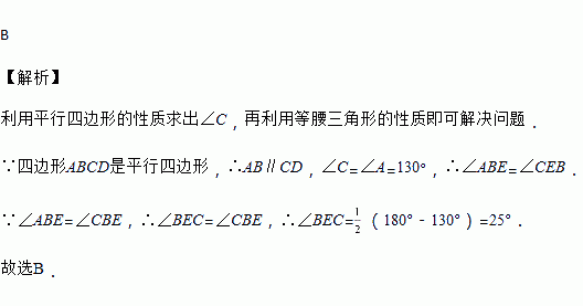 如图,平行四边形ABCD中,∠ABC的角平分线交边CD于点E,∠A=130°,则∠BEC的度数是( )