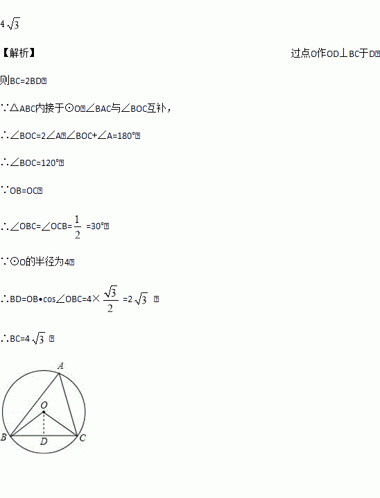 如图,⊙O的半径为4,△ABC是⊙O的内接三角形,连接OB、OC,若∠BAC和∠BOC互补,则弦BC的长度为_____.