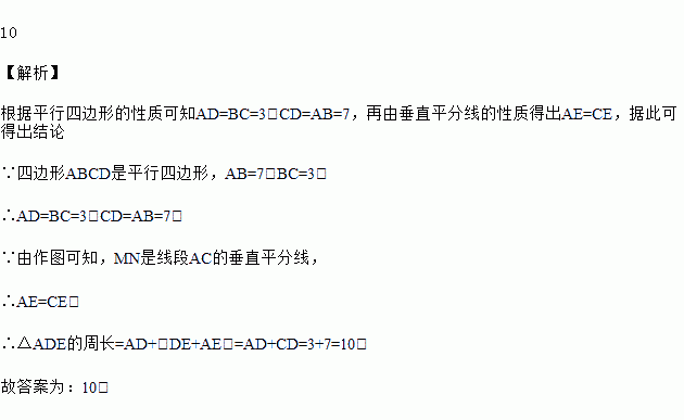 如图,?ABCD中,AB=7,BC=3,连接AC,分别以点A和点C为圆心,大于AC的长为半径作弧,两弧相交于点M,N,作直线MN,交CD于点E,连接AE,则△AED的周长是_____.