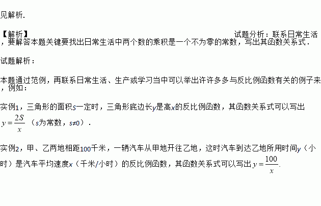 请你仿照上例另举一个在日常生活、生产或学习中具有反比例函数关系的量的实例,并写出它的函数关系式.