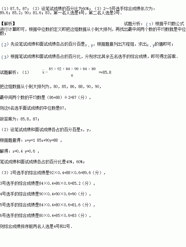 (1)这6名选手笔试成绩的平均数是 分,面试成绩的中位数是 分;