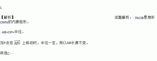 C 【解析】试题解析:∵PAOB是扇形OMN的内接矩形, ∴AB=OP=半径, 当P点在上移动时,半径一定,所以AB长度不变, 故选C.