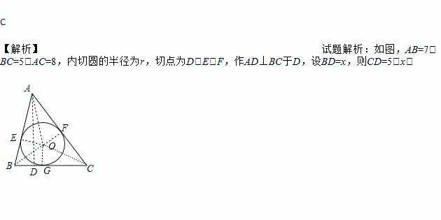 已知一个三角形的三边长分别为5、7、8,则其内切圆的半径为( )