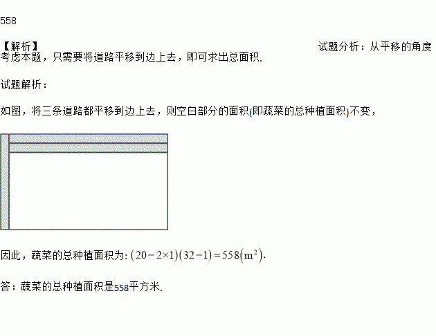 如图,张三打算在院落里种上蔬菜,已知院落为东西长32 m,南北宽20 m的长方形,为了行走方便,要修筑同样宽的三条道路:东西两条,南北一条,南北道路垂直于东西道路,余下的部分要分别种上西红柿、青椒、菜豆、黄瓜等蔬菜,若每条道路的宽均为1 m,求蔬菜的总种植面积是多少?