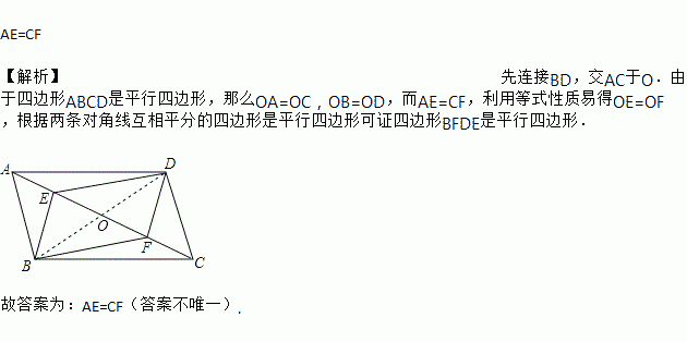 如图,AC是□ABCD的对角线,点E、F在AC上,要使四边形BFDE是平行四边形,还需要增加的一个条件是__________________(只要填写一种情况).