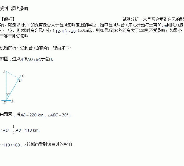 台风是一种自然灾害,它以台风中心为圆心,在周围数千米范围内形成气旋风暴,有极强的破坏力.根据气象观测,距沿海某城市A的正南方向220 km的B处有一台风中心,其中心最大风力为12级,每远离台风中心20 km,风力就会减弱一级.该台风中心正以15 km/h的速度沿北偏东30°方向往C处移动,且台风中心风力不变.若城市所受风力达到或超过四级,则称受台风影响.该城市是否受到该台风的影响?请说明理由.